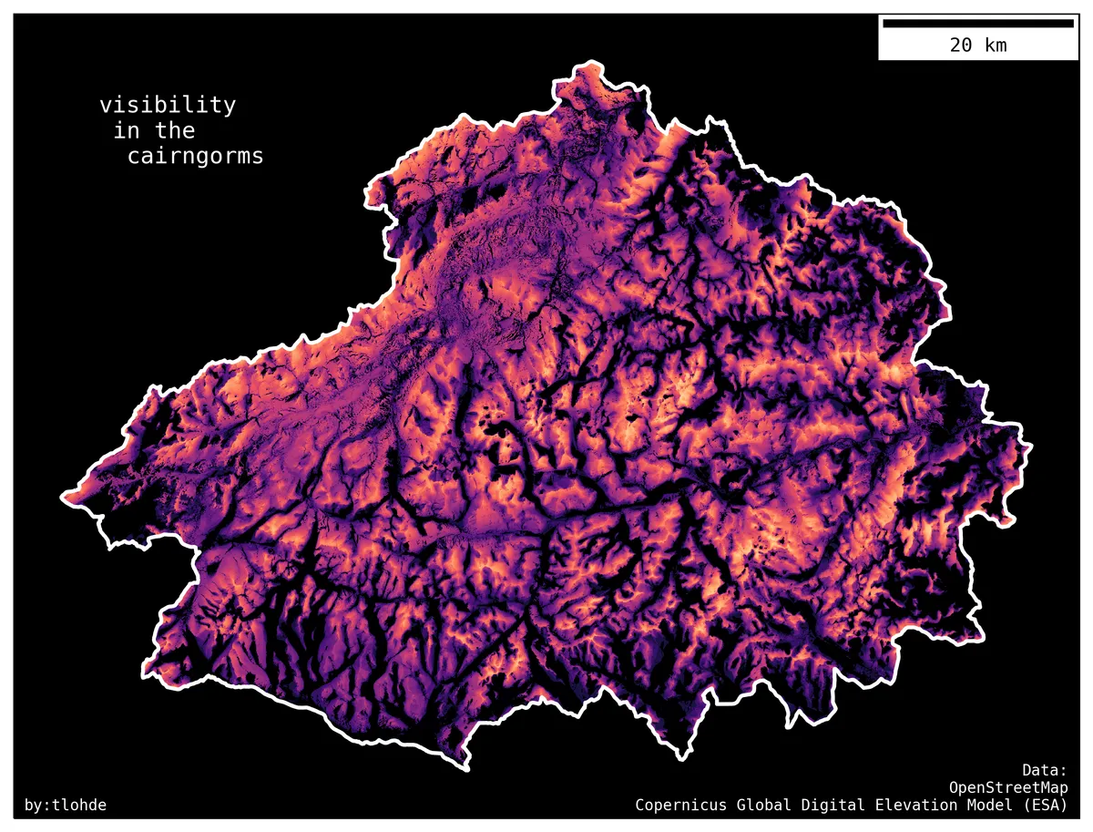 so what? so. the idea of a viewshed tool is, i think, pretty neat. take a digital elevation model, pick a point (and an observer height), run the tool and the output is a binary can-be-seen / can't-be-seen from that point. and if you pick, for example, all the peaks that are within the cairngorms national park boundary (here, all peaks were taken - regardless of height - from osm) and compute viewsheds for each one... you can add them all together to find where is best/worst place to hide.